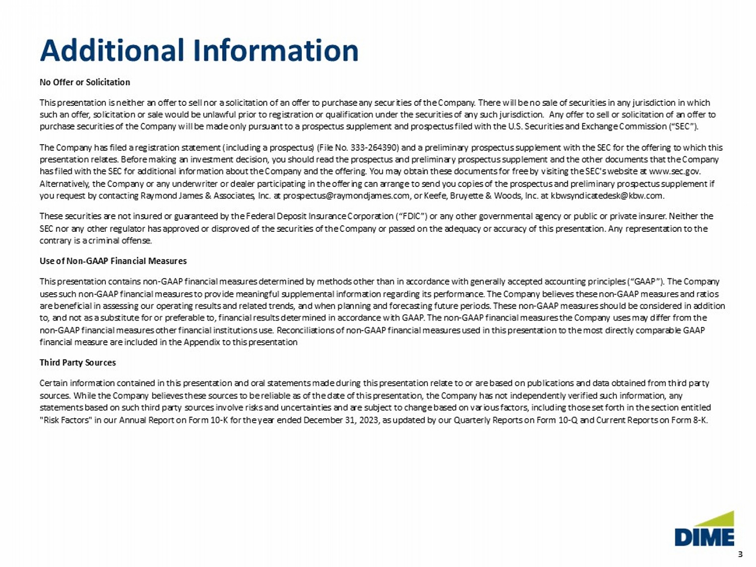 2 2 Forward - Looking Statements This presentation contains a number of forward - looking statements within the meaning of the federal securities laws. These state ments may be identified by use of words such as “annualized,” “anticipate,” “anticipated,” “believe,” “continue,” “could,” “estimate,” “expect,” “intend,” “likely,” “seek,” “ma y,” “outlook,” “plan,” “potential,” “predict,” “project,” “should,” “will,” “would,” “opportunity,” “opportunities,” “targeted,” “goal,” “path,” and similar terms and phrases, includi ng references to assumptions. Examples of forward - looking statements include, but are not limited to, the proposed offering of our common stock, which is opportunistic and sub jec t to market conditions, the expected use of proceeds from this offering (including any repositioning of the Company’s securities portfolio, growth initiatives, and other ac tions described herein), possible or assumed estimates and expectations with respect to the Company’s financial condition and market position, expected or anticipated rev enu e, profitability, and results of operations. In addition, although this presentation describes the current estimated impact of our potential use of a portion of the proceeds fr om this offering (including in connection with our future balance sheet optimization efforts, potential securities portfolio repositioning, and other actions described herein) , a ny such actions will depend on a number of factors, including market conditions and business developments. We are not required to apply any portion of the net proceeds of this o ffe ring for any particular purpose, and our management will have broad discretion in allocating the net proceeds of the offering. Accordingly, our management may not app ly the net proceeds of this offering as described herein, and our future financial condition and result of operations may differ significantly from the prospective estimates p res ented herein. Forward - looking statements are based upon various assumptions and analyses made by Dime Community Bancshares, Inc. (together with its direct and indirect subsidia rie s, the “Company”), in light of management’s experience and its perception of historical trends, current conditions and expected future developments, as well as other fac tor s it believes appropriate under the circumstances. These statements are not guarantees of future performance and are subject to risks, uncertainties and other factors (many of whi ch are beyond the Company’s control) that could cause actual conditions or results to differ materially from those expressed or implied by such forward - looking statements. Acco rdingly, you should not place undue reliance on such statements. These factors include, without limitation, the following: • increases in competitive pressure among financial institutions and from non - financial institutions; • inflation and fluctuation in market interest rates, which may affect demand for our products, interest margins and the fair v alu e of financial instruments; • changes in deposit flows, the cost of funds, loan demand or real estate values; • changes in the quality and composition of our loan or investment portfolios or unanticipated or significant increases in loan lo sses; • changes in accounting principles, policies or guidelines; • changes in corporate and/or individual income tax laws or policies; • general socio - economic conditions or events, including conditions caused by public health emergencies, international conflict, i nflation and recessionary pressures, either nationally or locally in some or all areas in which the Company conducts business, or conditions in the securities markets or th e banking industry; • legislative, regulatory or policy changes; • technological changes, which may be more difficult or expensive than the Company anticipates; • failures or breaches of information technology security systems; • success or consummation of new business initiatives or the integration of any acquired entities may be more difficult or expe nsi ve than the Company anticipates; • litigation or other matters before regulatory agencies; and • the risks referred to in the section entitled "Risk Factors" in our Annual Report on Form 10 - K for the year ended December 31, 2 023, as updated by our Quarterly Reports on Form 10 - Q and Current Reports on Form 8 - K. Forward - looking statements speak only as of the date on which such statements are made. There is no assurance that future result s, levels of activity, performance or goals will be achieved. Except as required by law, the Company has no obligation to update any forward - looking statements to reflect events or circumstances after the date of this document.