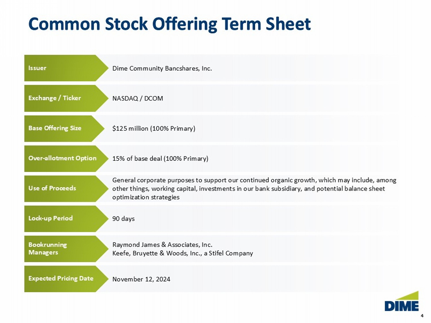 4 4 Common Stock Offering Term Sheet November 12 , 2024 Raymond James & Associates, Inc. Keefe, Bruyette & Woods, Inc., a Stifel Company 90 days General corporate purposes to support our continued organic growth, which may include, among other things, working capital, investments in our bank subsidiary, and potential balance sheet optimization strategies 15% of base deal (100% Primary) $125 million (100% Primary) Dime Community Bancshares, Inc. NASDAQ / DCOM Issuer Exchange / Ticker Base O ffering S ize Over - allotment Option Use of Proceeds Lock - up Period Bookrunning Managers Expected Pricing Date Common Stock Offering Term Sheet
