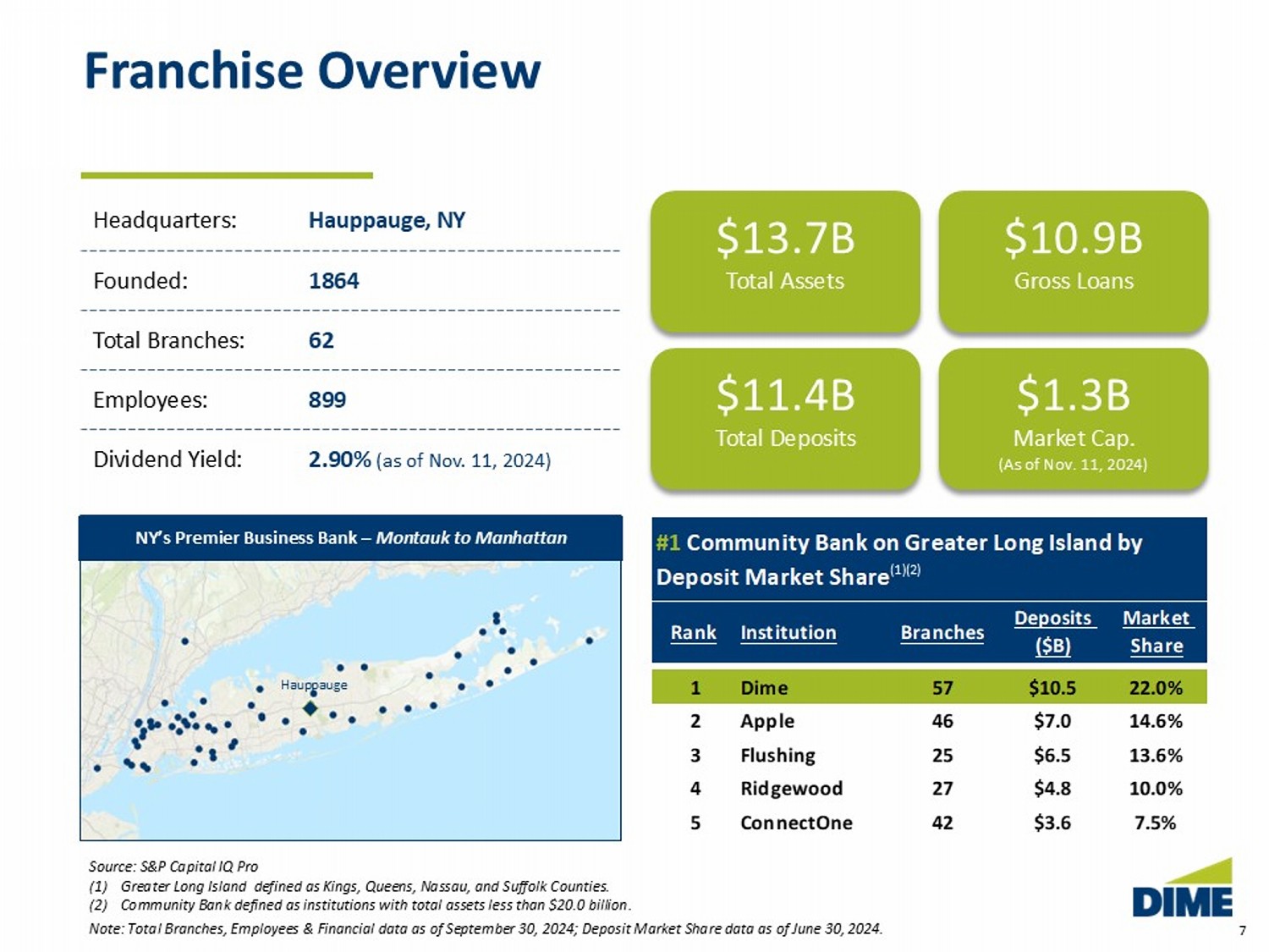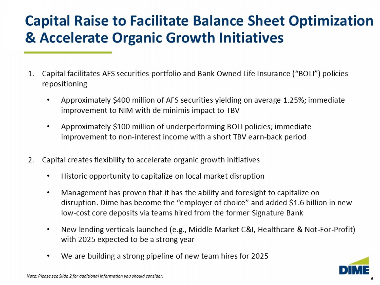 6 1. Capital facilitates AFS securities portfolio and Bank Owned Life Insurance (“BOLI”) policies repositioning • Approximately $400 million of AFS securities yielding on average 1.25%; immediate improvement to NIM with de minimis impact to TBV • Approximately $100 million of underperforming BOLI policies; immediate improvement to non - interest income with a short TBV earn - back period 2. Capital creates flexibility to accelerate organic growth initiatives • Historic opportunity to capitalize on local market disruption • Management has proven that it has the ability and foresight to capitalize on disruption. Dime has become the “employer of choice” and added $1.6 billion in new low - cost core deposits via teams hired from the former Signature Bank • New lending verticals launched (e.g., Middle Market C&I, Healthcare & Not - For - Profit) with 2025 expected to be a strong year • We are building a strong pipeline of new team hires for 2025 Capital Raise to Facilitate Balance Sheet Optimization & Accelerate Organic Growth Initiatives Note: Please see Slide 2 for additional information you should consider.
