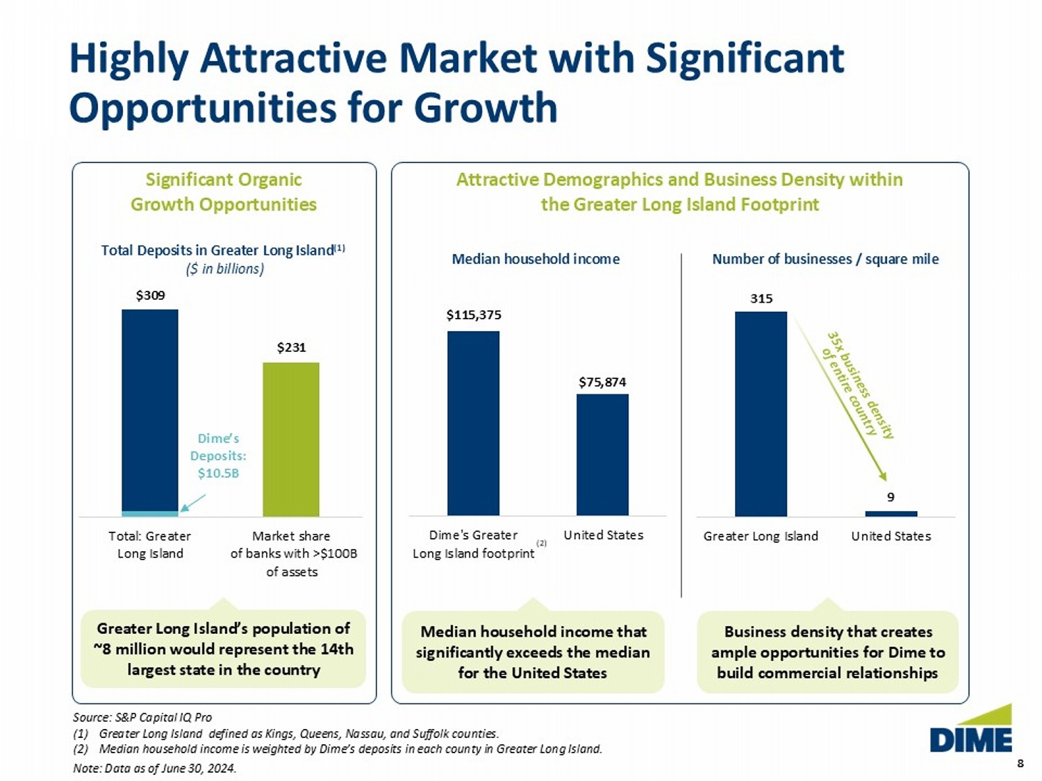 7 Hauppauge Rank Institution Branches Deposits ($B) Market Share 1 Dime 57 $10.5 22.0% 2 Apple 46 $7.0 14.6% 3 Flushing 25 $6.5 13.6% 4 Ridgewood 27 $4.8 10.0% 5 ConnectOne 42 $3.6 7.5% #1 Community Bank on Greater Long Island by Deposit Market Share Franchise Overview NY’s Premier Business Bank – Montauk to Manhattan $11.4B Total Deposits $13.7B Total Assets $10.9B Gross Loans $1.3B Market Cap. (As of Nov. 11, 2024) Hauppauge, NY Headquarters: 1864 Founded: 62 Total Branches: 899 Employees: 2.90% (as of Nov. 11, 2024) Dividend Yield: Source: S&P Capital IQ Pro (1) Greater Long Island defined as Kings, Queens, Nassau, and Suffolk Counties. (2) Community Bank defined as institutions with total assets less than $20.0 billion. Note: Total Branches, Employees & Financial data as of September 30, 2024; Deposit Market Share data as of June 30, 2024. (1)(2)