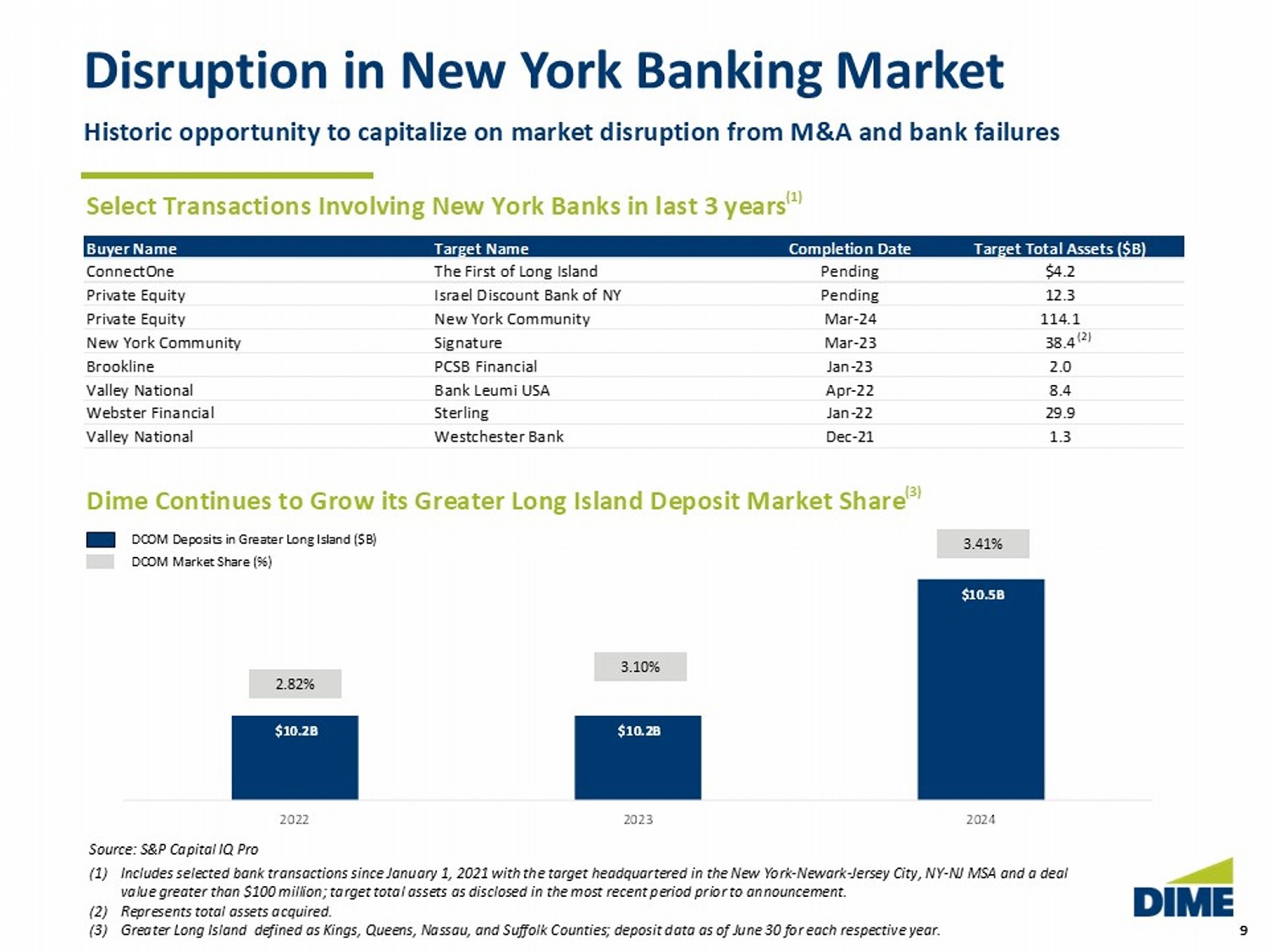 8 8 Highly Attractive Market with Significant Opportunities for Growth $309 $231 Total: Greater Long Island Market share of banks with >$100B of assets $115,375 $75,874 Dime's Greater Long Island footprint United States Total Deposits in Greater Long Island (1) ($ in billions) Median household income Number of businesses / square mile 315 9 Greater Long Island United States (2) Significant Organic Growth Opportunities Greater Long Island’s population of ~8 million would represent the 14th largest state in the country Attractive Demographics and Business Density within the Greater Long Island Footprint Dime’s Deposits: $10.5B Median household income that significantly exceeds the median for the United States Business density that creates ample opportunities for Dime to build commercial relationships Source: S&P Capital IQ Pro (1) Greater Long Island defined as Kings, Queens, Nassau, and Suffolk counties. (2) Median household income is weighted by Dime’s deposits in each county in Greater Long Island. Note: Data as of June 30, 2024.