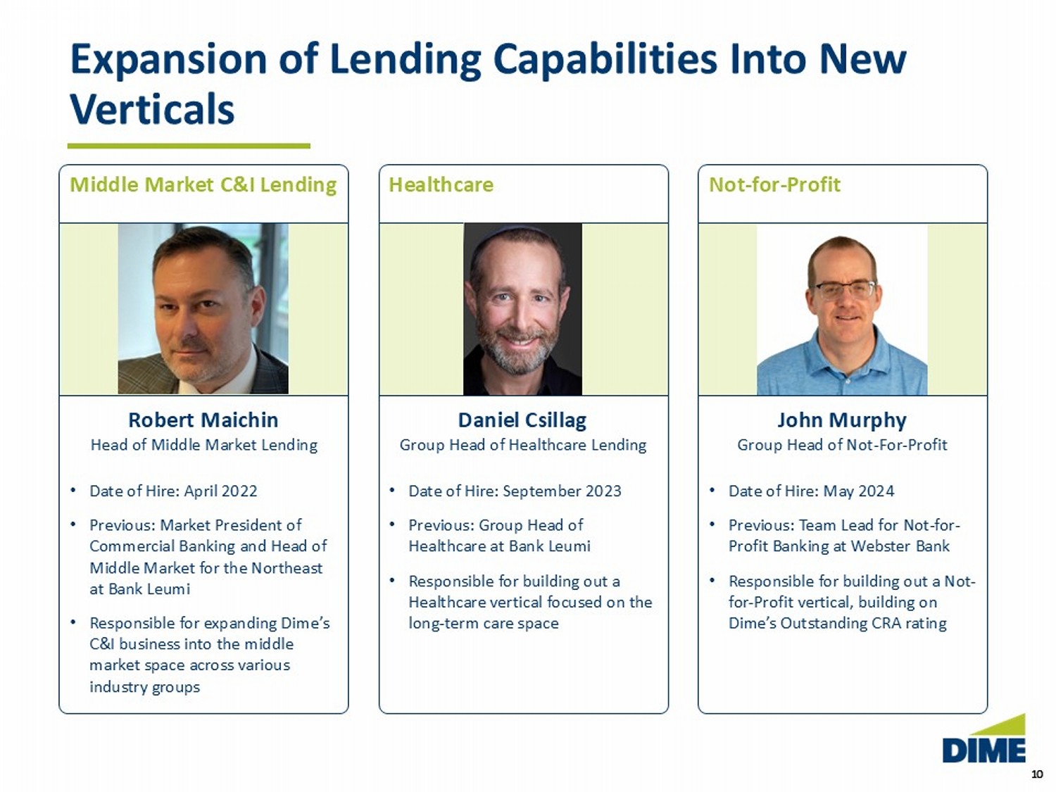 9 9 $10.2B $10.2B $10.5B 2022 2023 2024 2.82% 3.10% 3.41% Disruption in New York Banking Market Source: S&P Capital IQ Pro (1) Includes selected bank transactions since January 1, 2021 with the target headquartered in the New York - Newark - Jersey City, NY - N J MSA and a deal value greater than $100 million; target total assets as disclosed in the most recent period prior to announcement. (2) Represents total assets acquired. (3) Greater Long Island defined as Kings, Queens, Nassau, and Suffolk Counties; deposit data as of June 30 for each respective y ear . Select Transactions Involving New York Banks in last 3 years (1) Dime Continues to Grow its Greater Long Island Deposit Market Share (3) DCOM Deposits in Greater Long Island ($B) DCOM Market Share (%) (2) Historic opportunity to capitalize on market disruption from M&A and bank failures Buyer Name Target Name Completion Date Target Total Assets ($B) ConnectOne The First of Long Island Pending $4.2 Private Equity Israel Discount Bank of NY Pending 12.3 Private Equity New York Community Mar-24 114.1 New York Community Signature Mar-23 38.4 Brookline PCSB Financial Jan-23 2.0 Valley National Bank Leumi USA Apr-22 8.4 Webster Financial Sterling Jan-22 29.9 Valley National Westchester Bank Dec-21 1.3
