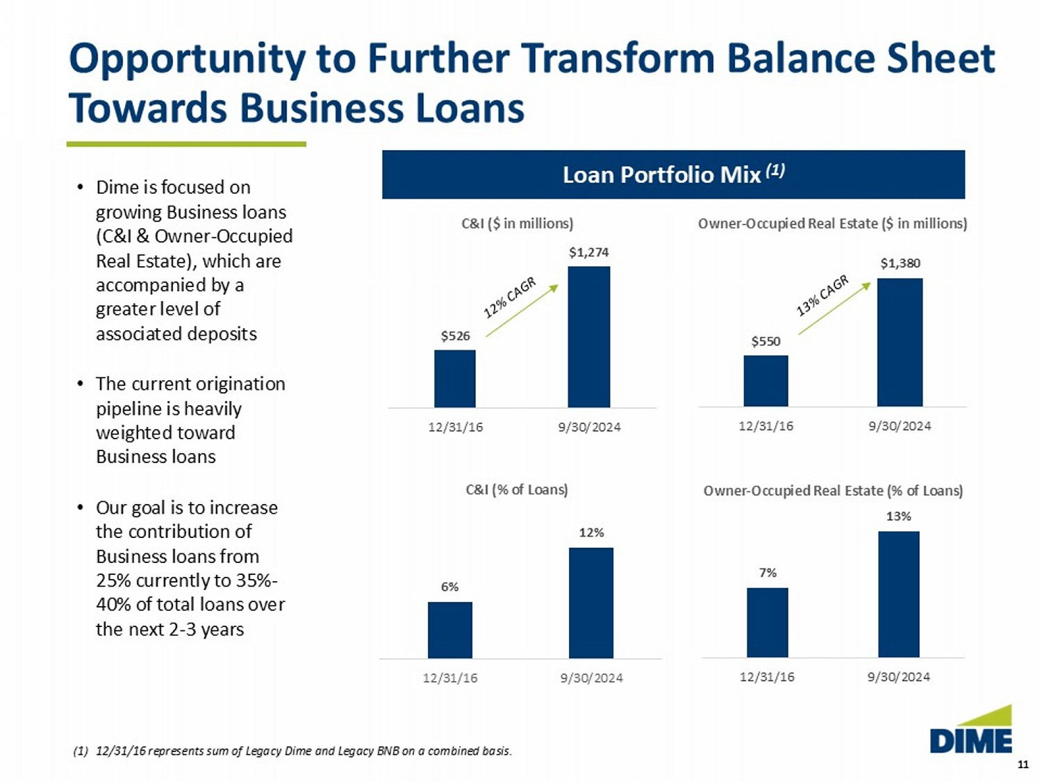 10 10 Middle Market C&I Lending Healthcare Not - for - Profit Expansion of Lending Capabilities Into New Verticals Robert Maichin Head of Middle Market Lending • Date of Hire: April 2022 • Previous: Market President of Commercial Banking and Head of Middle Market for the Northeast at Bank Leumi • Responsible for expanding Dime’s C&I business into the middle market space across various industry groups Daniel Csillag Group Head of Healthcare Lending • Date of Hire: September 2023 • Previous: Group Head of Healthcare at Bank Leumi • Responsible for building out a Healthcare vertical focused on the long - term care space John Murphy Group Head of Not - For - Profit • Date of Hire: May 2024 • Previous: Team Lead for Not - for - Profit Banking at Webster Bank • Responsible for building out a Not - for - Profit vertical, building on Dime’s Outstanding CRA rating