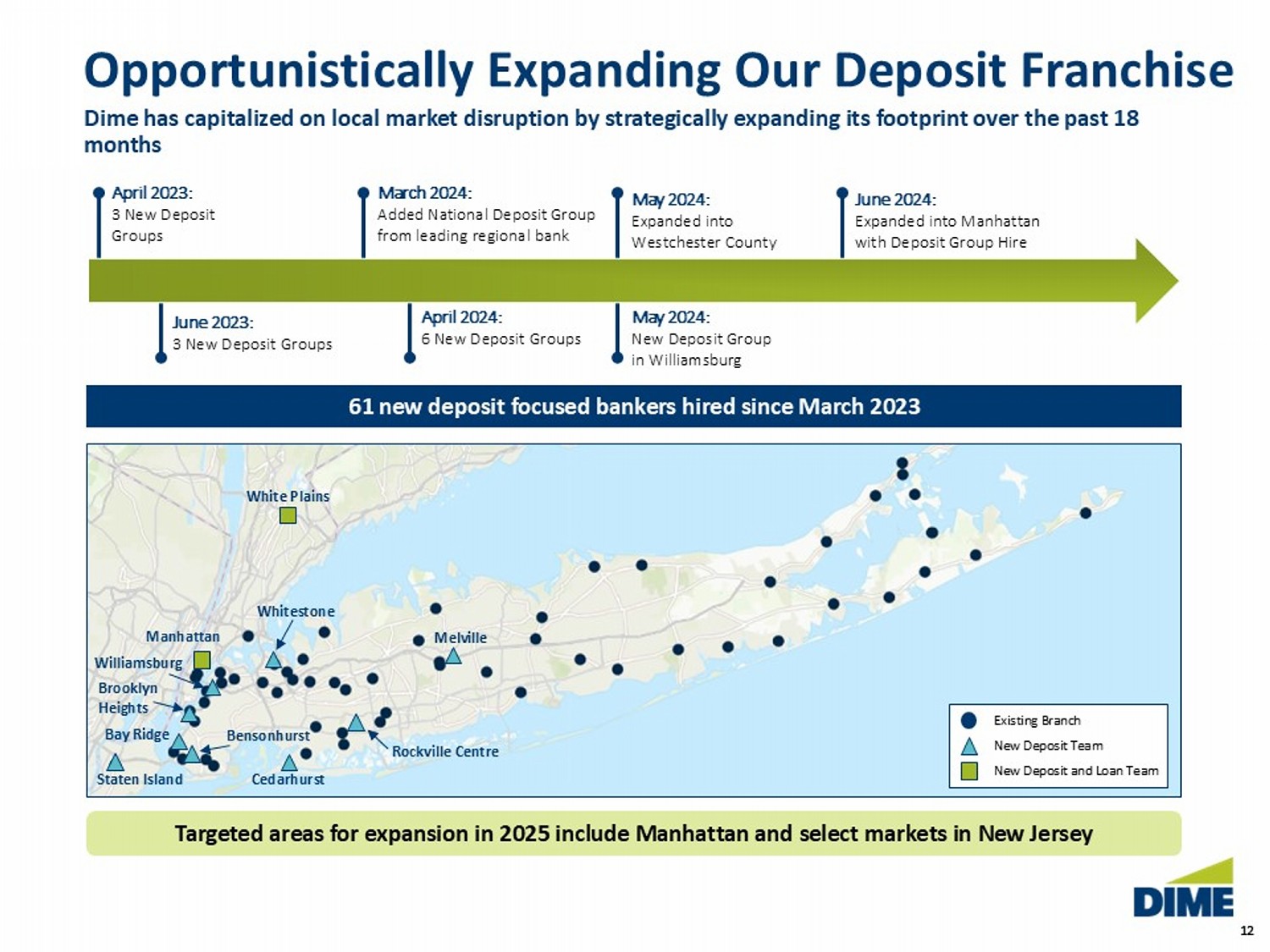 11 11 Opportunity to Further Transform Balance Sheet Towards Business Loans Loan Portfolio Mix (1) (1) 12/31/16 represents sum of Legacy Dime and Legacy BNB on a combined basis. $526 $1,274 12/31/16 9/30/2024 C&I ($ in millions) 6% 12% 12/31/16 9/30/2024 C&I (% of Loans) 7% 13% 12/31/16 9/30/2024 $550 $1,380 12/31/16 9/30/2024 • Dime is focused on growing Business loans (C&I & Owner - Occupied Real Estate), which are accompanied by a greater level of associated deposits • The current origination pipeline is heavily weighted toward Business loans • Our goal is to increase the contribution of Business loans from 25% currently to 35% - 40% of total loans over the next 2 - 3 years Owner - Occupied Real Estate (% of Loans) Owner - Occupied Real Estate ($ in millions)
