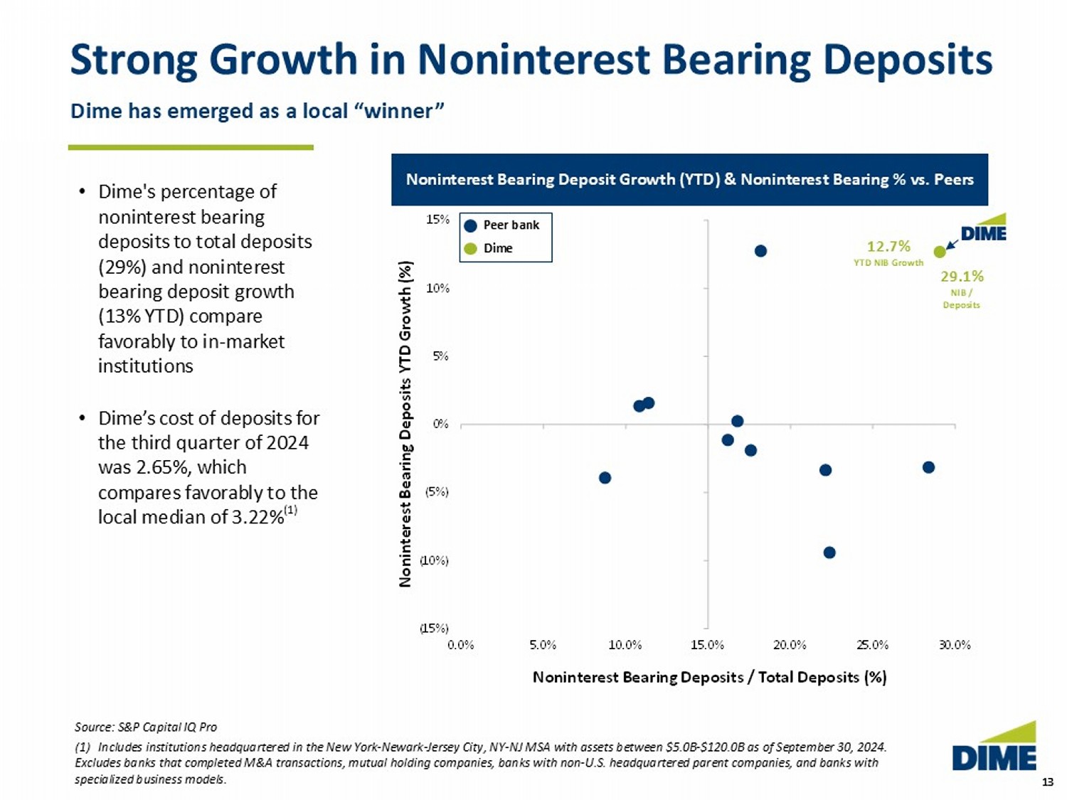 12 12 Opportunistically Expanding Our Deposit Franchise Dime has capitalized on local market disruption by strategically expanding its footprint over the past 18 months April 2023: 3 New Deposit Groups June 2023: 3 New Deposit Groups March 2024: Added National Deposit Group from leading regional bank April 2024: 6 New Deposit Groups May 2024: Expanded into Westchester County May 2024: New Deposit Group in Williamsburg June 2024: Expanded into Manhattan with Deposit Group Hire 61 new deposit focused bankers hired since March 2023 Williamsburg Manhattan Rockville Centre Whitestone Melville Staten Island Cedarhurst Brooklyn Heights Bay Ridge Bensonhurst White Plains Existing Branch New Deposit Team New Deposit and Loan Team Targeted areas for expansion in 2025 include Manhattan and select markets in New Jersey