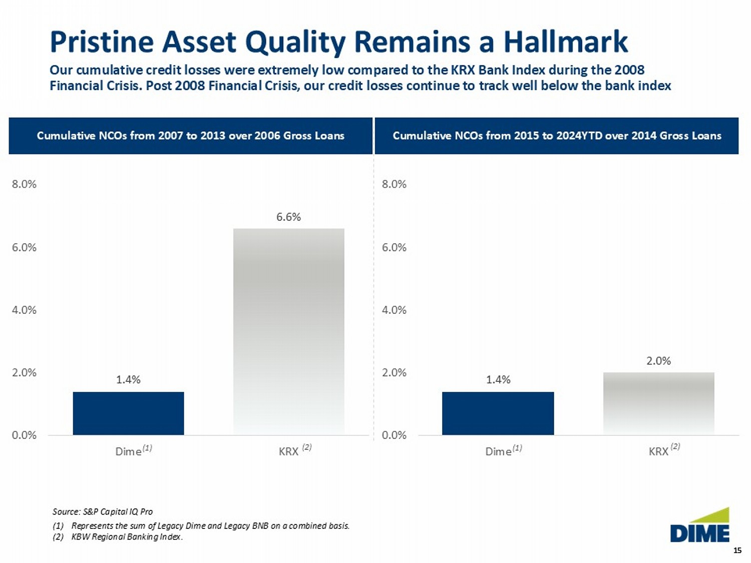 14 14 29bp 10bp DCOM Nationwide Peers (Median) Significant ’24Q1 – ’24Q3 Net Interest Margin Expansion vs. Nationwide Peers (2) Improving NIM Will Drive Higher Profitability 1. NIM bottomed in the first quarter of 2024 and has since expanded by 29bp in the subsequent two quarters. YTD expansion has been driven by core deposit growth 2. 50bp rate cut in September is expected to benefit the fourth quarter 2024 NIM. Additional rate cuts in Q4 2024 and 2025 are expected to result in further NIM expansion 3. For every 25bp of rate cuts, we expect 5 – 6bp of NIM expansion from the adjustment of existing deposit and loan rates 4. Back book repricing is the final piece in structurally restoring NIM to a level greater than 3.25% • ~$1.9 billion of fixed/adjustable loans that mature/reprice in 2H 2025 and FY 2026 • Potential to deliver an additional 40 – 45bp of NIM expansion from back book repricing (1) 2.21% 2.41% 2.50% Q1 2024 Q2 2024 Q3 2024 Dime Net Interest Margin Quarterly Expansion Source: S&P Capital IQ Pro (1) Weighted average rate on $1.9 billion back book is 3.9%. Assuming loans reprice at +225 – 250bp over the 5 - yr Treasury implies a 4 0 – 45bp benefit to the NIM. (2) Major exchange - traded U.S. - based banks and thrifts with total assets between $10 billion to $15 billion, excluding merger target s, mutuals, and banks with specialized business models.