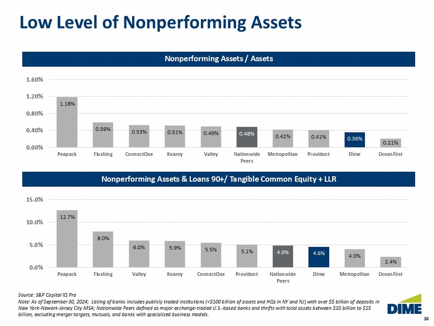 15 15 Pristine Asset Quality Remains a Hallmark Our cumulative credit losses were extremely low compared to the KRX Bank Index during the 2008 Financial Crisis. Post 2008 Financial Crisis, our credit losses continue to track well below the bank index Source: S&P Capital IQ Pro (1) Represents the sum of Legacy Dime and Legacy BNB on a combined basis. (2) KBW Regional Banking Index. Cumulative NCOs from 2007 to 2013 over 2006 Gross Loans Cumulative NCOs from 2015 to 2024YTD over 2014 Gross Loans 1.4% 6.6% 0.0% 2.0% 4.0% 6.0% 8.0% Dime KRX (1) (2) 1.4% 2.0% 0.0% 2.0% 4.0% 6.0% 8.0% Dime KRX (1) (2)