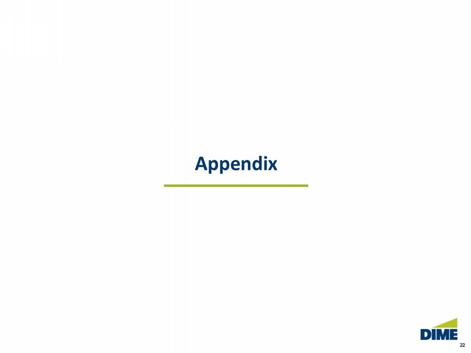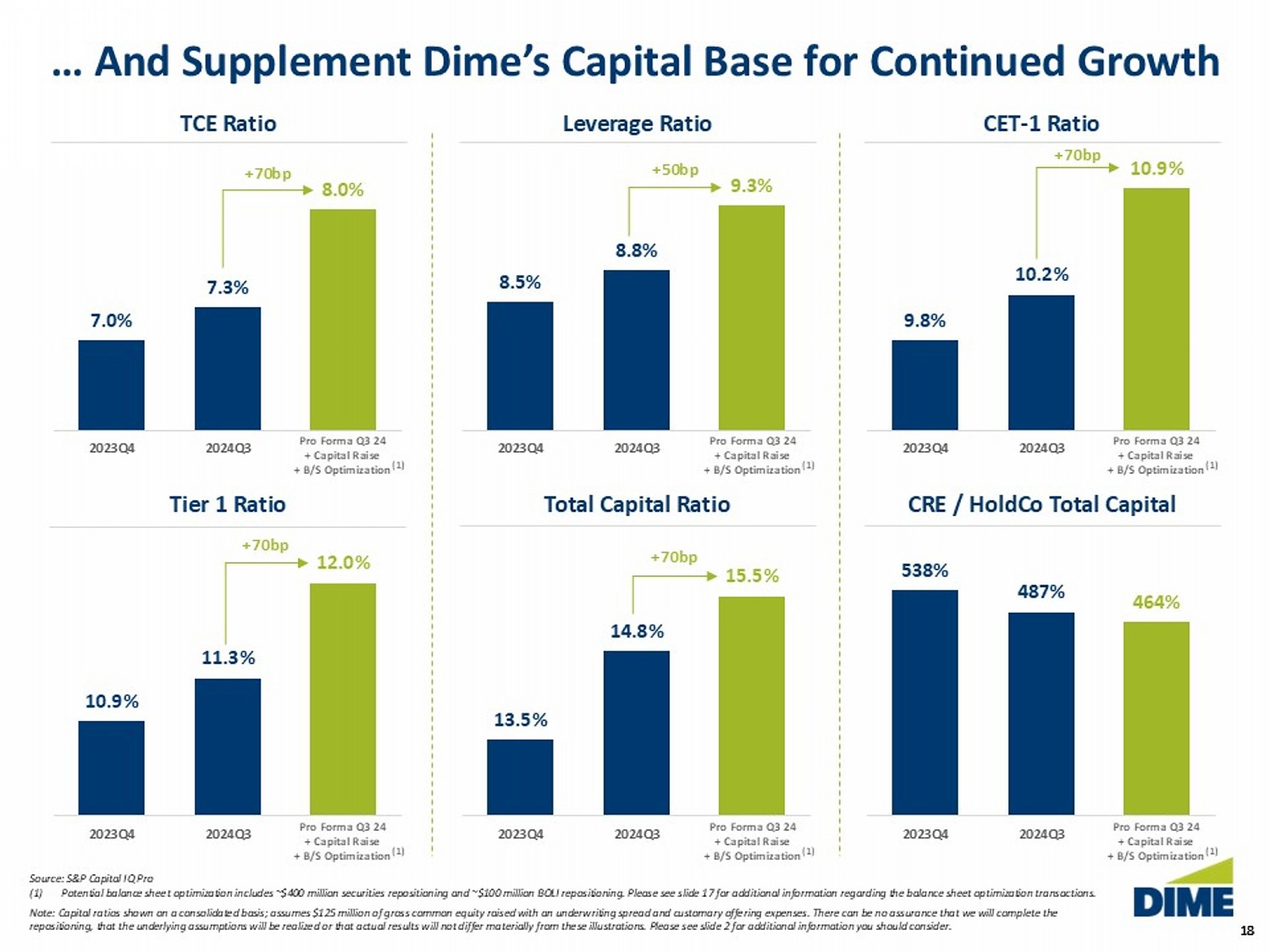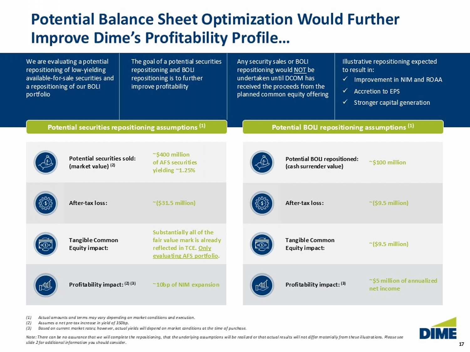 17 17 Potential Balance Sheet Optimization Would Further Improve Dime’s Profitability Profile… We are evaluating a potential repositioning of low - yielding available - for - sale securities and a repositioning of our BOLI portfolio The goal of a potential securities repositioning and BOLI repositioning is to further improve profitability Any security sales or BOLI repositioning would NOT be undertaken until DCOM has received the proceeds from the planned common equity offering Illustrative repositioning expected to result in: x Improvement in NIM and ROAA x Accretion to EPS x Stronger capital generation Potential securities repositioning assumptions (1) Potential BOLI repositioning assumptions (1) ~$400 million of AFS securities yielding ~1.25% Potential securities sold: (market value) (2) ~($31.5 million) After - tax loss: Substantially all of the fair value mark is already reflected in TCE. Only evaluating AFS portfolio . Tangible Common Equity impact: ~10bp of NIM expansion Profitability impact: (2) (3) (1) Actual amounts and terms may vary depending on market conditions and execution. (2) Assumes a net pre - tax increase in yield of 350bp. (3) Based on current market rates; however, actual yields will depend on market conditions at the time of purchase. Note: There can be no assurance that we will complete the repositioning, that the underlying assumptions will be realized or tha t actual results will not differ materially from these illustrations. Please see slide 2 for additional information you should consider. ~$100 million Potential BOLI repositioned: (cash surrender value) ~($9.5 million) After - tax loss: ~($9.5 million) Tangible Common Equity impact: ~$5 million of annualized net income Profitability impact: (3)