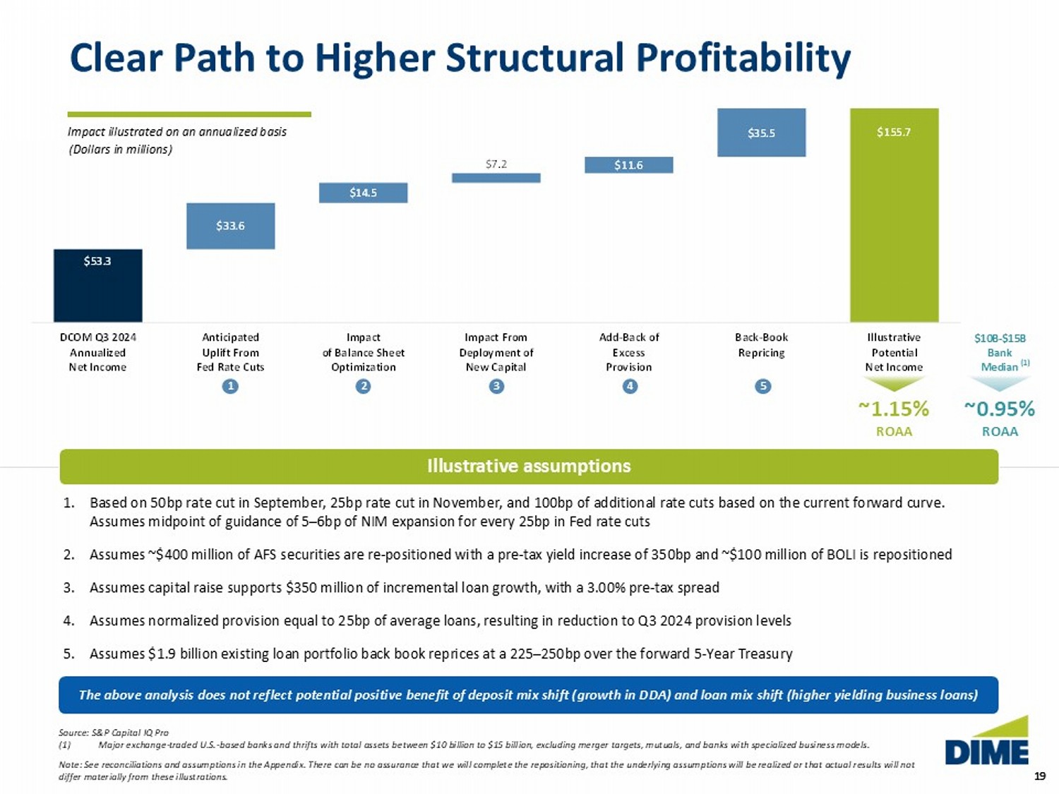 18 18 TCE Ratio 7.0% 7.3% 8.0% 2023Q4 2024Q3 – … And Supplement Dime’s Capital Base for Continued Growth Source: S&P Capital IQ Pro (1) Potential b alance shee t optimization includes ~$400 million securities repositioning and ~$100 million BOLI repositioning. Please see slide 17 for additional information regarding the balance sheet optimization transactions. Note: Capital ratios shown on a consolidated basis; assumes $125 million of gross common equity raised with an underwriting s pre ad and customary offering expenses. There can be no assurance that we will complete the repositioning, that the underlying assumptions will be realized or that actual results will not differ materially from these ill ustrations. Please see slide 2 for additional information you should consider. CET - 1 Ratio 9.8% 10.2% 10.9% 2023Q4 2024Q3 – Tier 1 Ratio Total Capital Ratio Leverage Ratio 10.9% 11.3% 12.0% 2023Q4 2024Q3 – 13.5% 14.8% 15.5% 2023Q4 2024Q3 – 8.5% 8.8% 9.3% 2023Q4 2024Q3 – CRE / HoldCo Total Capital 538% 487% 464% 2023Q4 2024Q3 – +70bp Pro Forma Q3 24 + Capital Raise + B/S Optimization Pro Forma Q3 24 + Capital Raise + B/S Optimization Pro Forma Q3 24 + Capital Raise + B/S Optimization Pro Forma Q3 24 + Capital Raise + B/S Optimization Pro Forma Q3 24 + Capital Raise + B/S Optimization Pro Forma Q3 24 + Capital Raise + B/S Optimization + 7 0bp + 7 0bp + 7 0bp +50bp (1) (1) (1) (1) (1) (1)