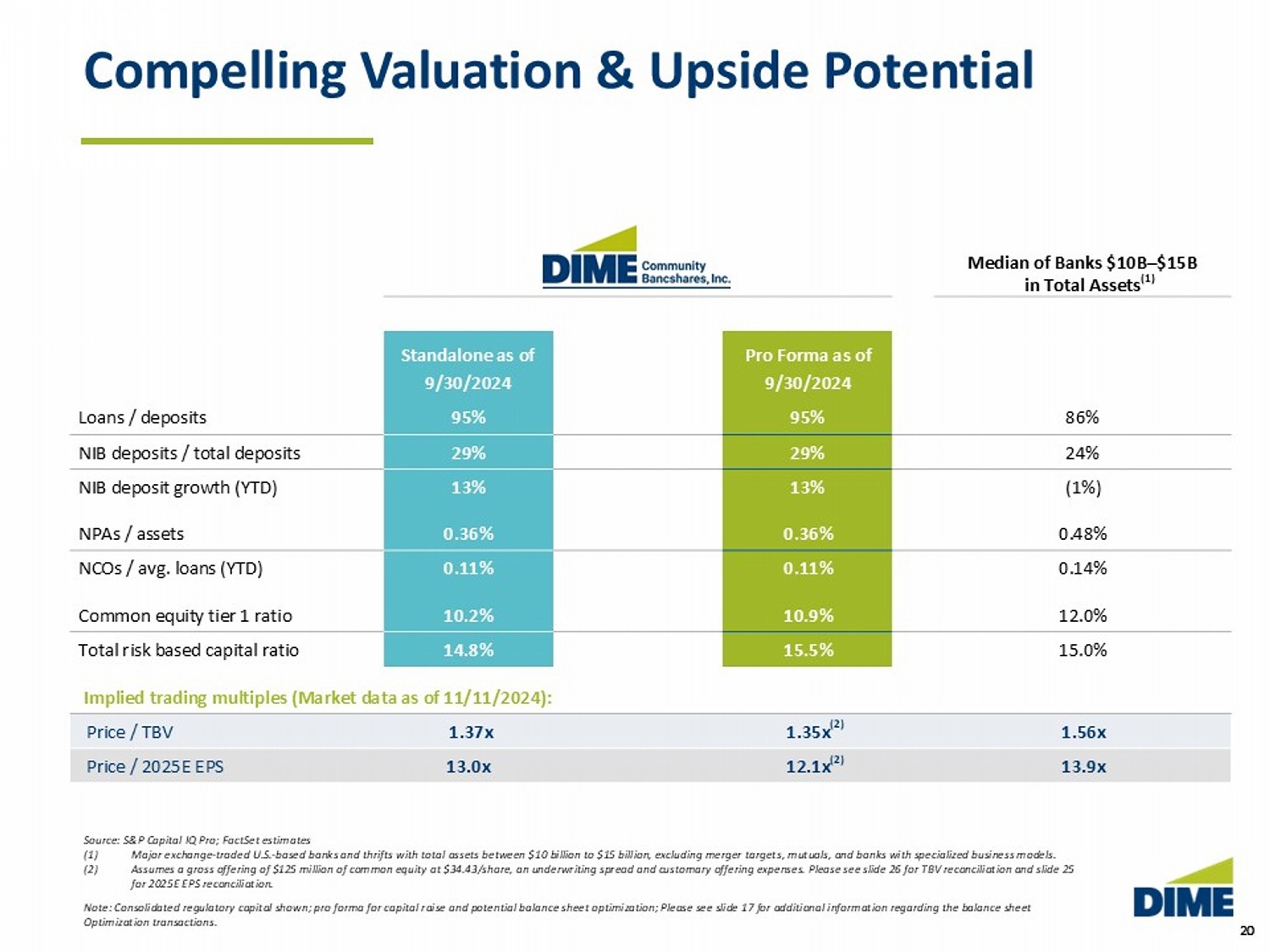 19 19 $10B - $15B Bank Median $53.3 $108.6 $155.7 $33.6 $14.5 $7.2 $11.6 $35.5 DCOM Q3 2024 Annualized Net Income Anticipated Uplift From Fed Rate Cuts Impact of Balance Sheet Optimization Impact From Deployment of New Capital Add-Back of Excess Provision Back-Book Repricing Illustrative Potential Net Income Clear Path to Higher Structural Profitability ~1.15% ROAA Illustrative assumptions 1. Based on 50bp rate cut in September, 25bp rate cut in November, and 100bp of additional rate cuts based on the current forwar d c urve. Assumes midpoint of guidance of 5 – 6bp of NIM expansion for every 25bp in Fed rate cuts 2. Assumes ~$400 million of AFS securities are re - positioned with a pre - tax yield increase of 350bp and ~$100 million of BOLI is re positioned 3. Assumes capital raise supports $350 million of incremental loan growth, with a 3.00% pre - tax spread 4. Assumes normalized provision equal to 25bp of average loans, resulting in reduction to Q3 2024 provision levels 5. Assumes $1.9 billion existing loan portfolio back book reprices at a 225 – 250bp over the forward 5 - Year Treasury Source: S&P Capital IQ Pro (1) Major exchange - traded U.S. - based banks and thrifts with total assets between $10 billion to $15 billion, excluding merger target s, mutuals, and banks with specialized business models. Note: See reconciliations and assumptions in the Appendix. There can be no assurance that we will complete the repositioning, th at the underlying assumptions will be realized or that actual results will not differ materially from these illustrations. Impact illustrated on an annualized basis (1 ) ~0.95% ROAA (Dollars in millions) 1 2 3 4 5 The above analysis does not reflect potential positive benefit of deposit mix shift (growth in DDA) and loan mix shift (highe r y ielding business loans)