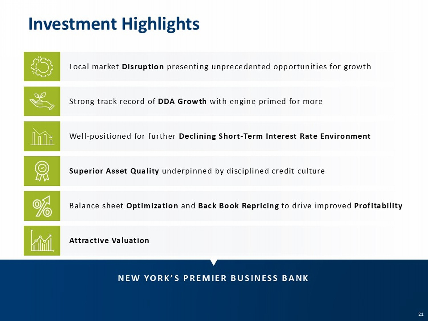 21 21 Local market Disruption presenting unprecedented opportunities for growth Strong track record of DDA Growth with engine primed for more Well - positioned for further Declining Short - Term Interest Rate Environment Superior Asset Quality underpinned by disciplined credit culture 21 NEW YORK’S PREMIER BUSINESS BANK Investment Highlights Attractive Valuation Balance sheet Optimization and Back Book Repricing to drive improved Profitability