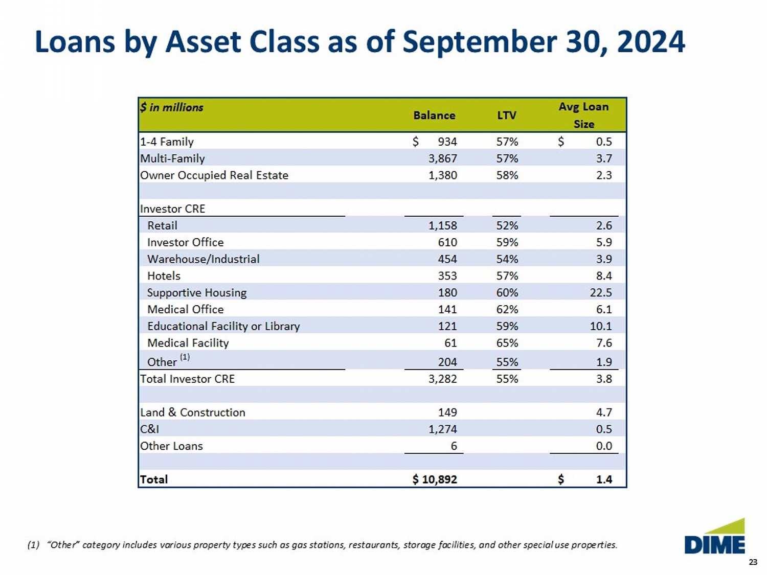 23 23 $ in millions Avg Loan Size 1-4 Family 934$ 57% 0.5$ Multi-Family 3,867 57% 3.7 Owner Occupied Real Estate 1,380 58% 2.3 Investor CRE Retail 1,158 52% 2.6 Investor Office 610 59% 5.9 Warehouse/Industrial 454 54% 3.9 Hotels 353 57% 8.4 Supportive Housing 180 60% 22.5 Medical Office 141 62% 6.1 Educational Facility or Library 121 59% 10.1 Medical Facility 61 65% 7.6 Other (1) 204 55% 1.9 Total Investor CRE 3,282 55% 3.8 Land & Construction 149 4.7 C&I 1,274 0.5 Other Loans 6 0.0 Total 10,892$ 1.4$ Balance LTV Loans by Asset Class as of September 30, 2024 (1) “Other” category includes various property types such as gas stations, restaurants, storage facilities, and other speci al use properties.
