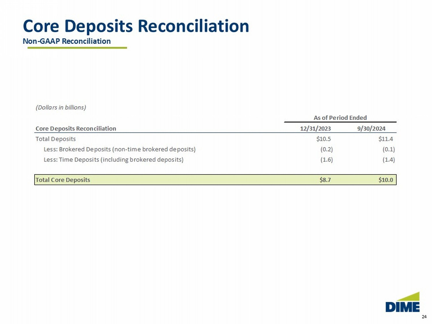 24 Core Deposits Reconciliation Non - GAAP Reconciliation (Dollars in billions) As of Period Ended Core Deposits Reconciliation 12/31/2023 9/30/2024 Total Deposits $10.5 $11.4 Less: Brokered Deposits (non-time brokered deposits) (0.2) (0.1) Less: Time Deposits (including brokered deposits) (1.6) (1.4) Total Core Deposits $8.7 $10.0