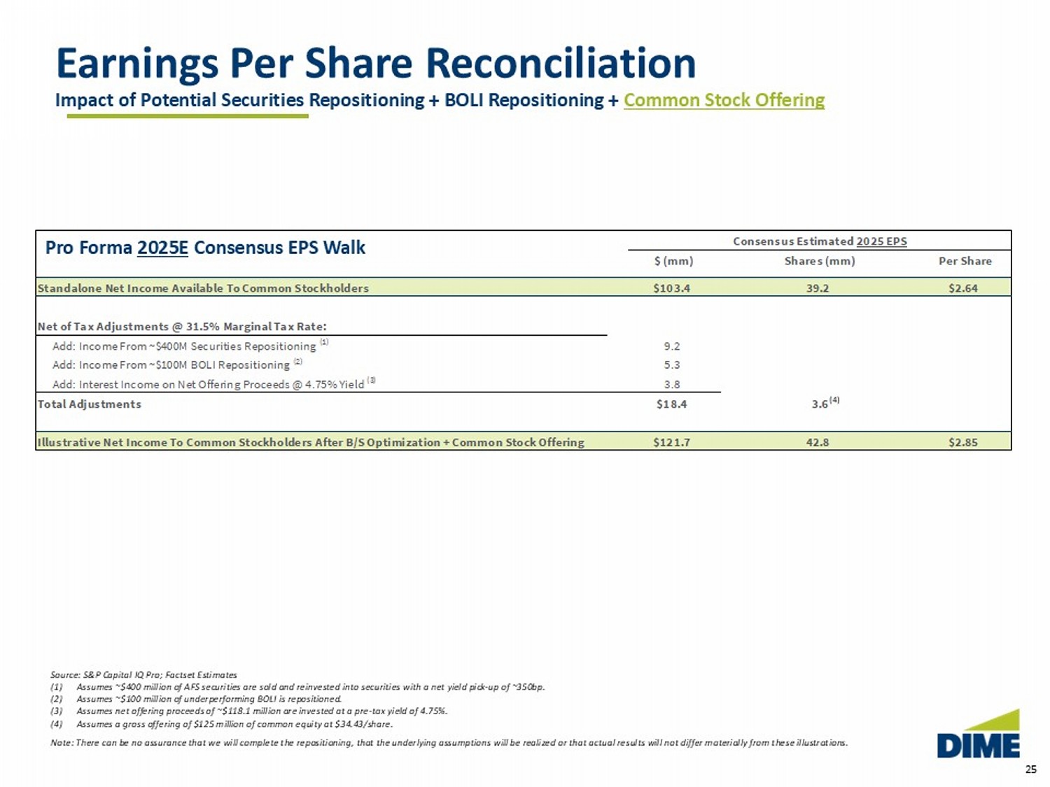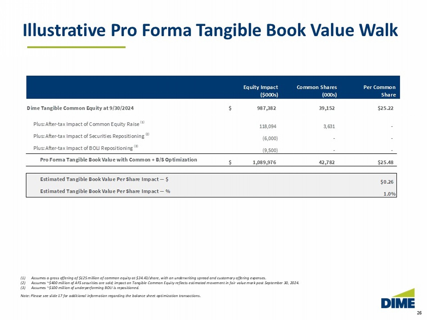 25 Consensus Estimated 2025 EPS $ (mm) Shares (mm) Per Share Standalone Net Income Available To Common Stockholders $103.4 39.2 $2.64 Net of Tax Adjustments @ 31.5% Marginal Tax Rate: Add: Income From ~$400M Securities Repositioning (1) 9.2 Add: Income From ~$100M BOLI Repositioning (2) 5.3 Add: Interest Income on Net Offering Proceeds @ 4.75% Yield (3) 3.8 Total Adjustments $18.4 3.6 Illustrative Net Income To Common Stockholders After B/S Optimization + Common Stock Offering $121.7 42.8 $2.85 Earnings Per Share Reconciliation Impact of Potential Securities Repositioning + BOLI Repositioning + Common Stock Offering Source: S&P Capital IQ Pro; Factset Estimates (1) Assumes ~$400 million of AFS securities are sold and reinvested into securities with a net yield pick - up of ~350bp. (2) Assumes ~$100 million of underperforming BOLI is repositioned. (3) Assumes net offering proceeds of ~$118.1 million are invested at a pre - tax yield of 4.75%. (4) Assumes a gross offering of $125 million of common equity at $34.43/share. Note: There can be no assurance that we will complete the repositioning, that the underlying assumptions will be realized or tha t actual results will not differ materially from these illustrations. (4) Pro Forma 2025E Consensus EPS Walk