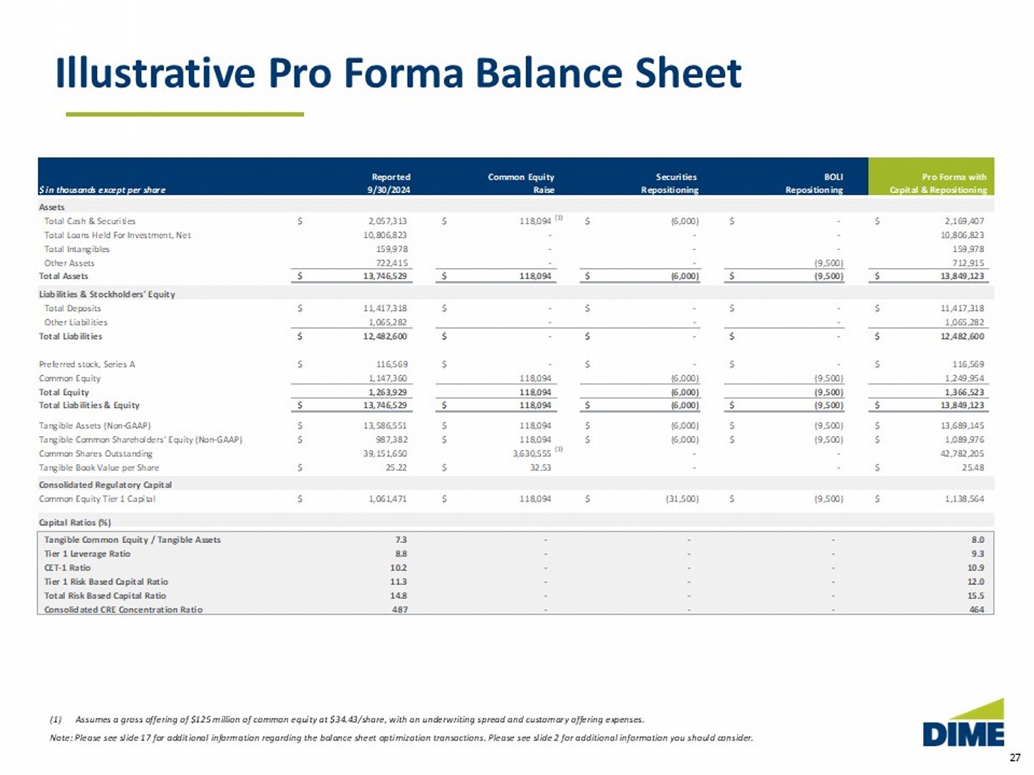 26 Illustrative Pro Forma Tangible Book Value Walk (1) Assumes a gross offering of $125 million of common equity at $34.43/share, with an underwriting spread and customary offering ex penses. (2) Assumes ~$400 million of AFS securities are sold ; impact on Tangible Common Equity reflects estimated movement in fair value mark post September 30, 2024 . (3) Assumes ~$100 million of underperforming BOLI is repositioned. Note: Please see slide 17 for additional information regarding the balance sheet optimization transactions. Equity Impact Common Shares Per Common ($000s) (000s) Share Dime Tangible Common Equity at 9/30/2024 987,382$ 39,152 $25.22 Plus: After-tax Impact of Common Equity Raise (1) 118,094 3,631 - Plus: After-tax Impact of Securities Repositioning (2) (6,000) - - Plus: After-tax Impact of BOLI Repositioning (3) (9,500) - - Pro Forma Tangible Book Value with Common + B/S Optimization 1,089,976$ 42,782 $25.48 Estimated Tangible Book Value Per Share Impact — $ $0.26 Estimated Tangible Book Value Per Share Impact — % 1.0%