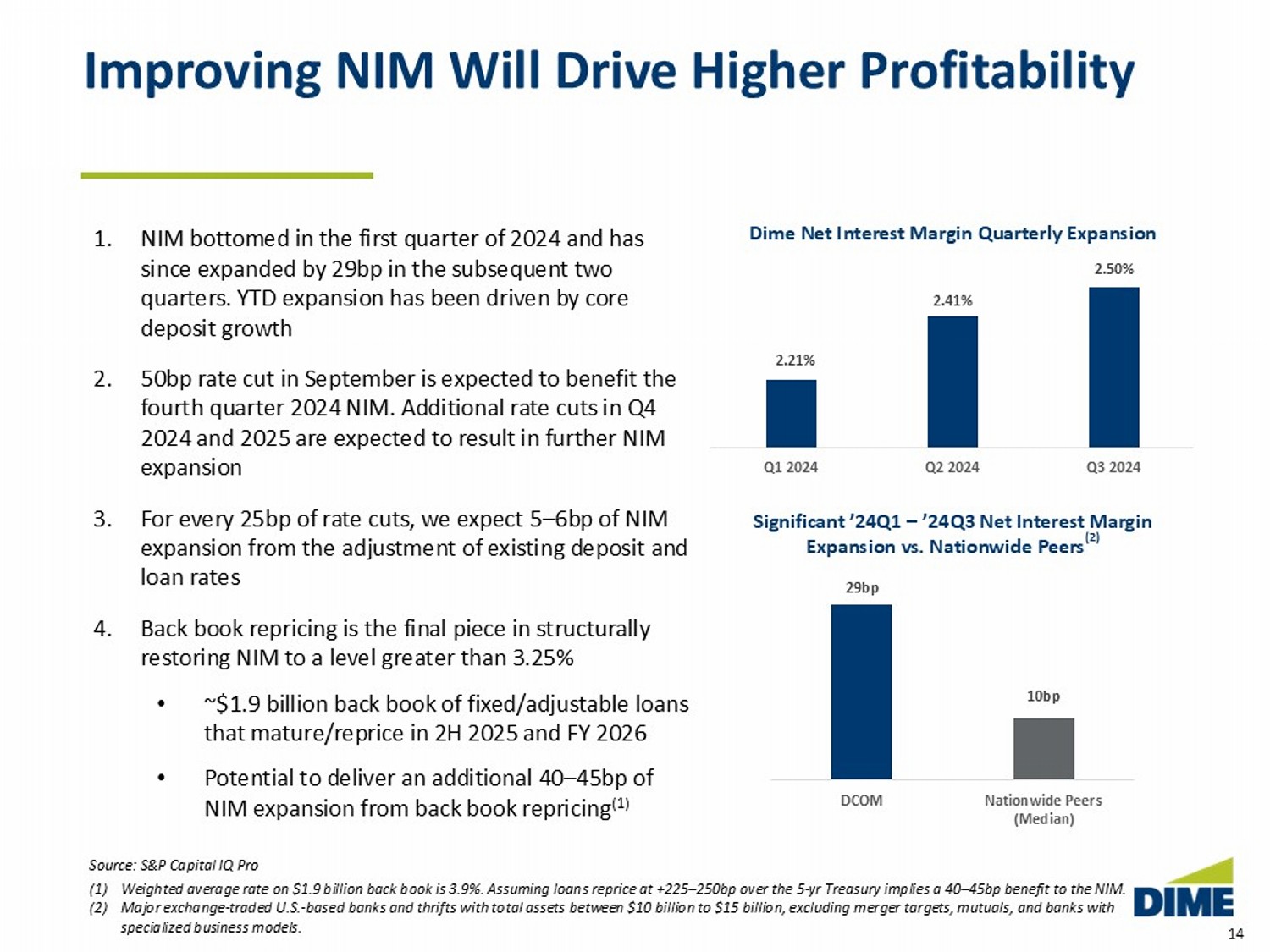 13 13 (15%) (10%) (5%) 0% 5% 10% 15% 0.0% 5.0% 10.0% 15.0% 20.0% 25.0% 30.0% Noninterest Bearing Deposits YTD Growth (%) Noninterest Bearing Deposits / Total Deposits (%) Strong Growth in Noninterest Bearing Deposits Source: S&P Capital IQ Pro (1) Includes institutions headquartered in the New York - Newark - Jersey City, NY - NJ MSA with assets between $5.0B - $120.0B as of September 30, 2024. Excludes banks that completed M&A transactions, mutual holding companies, banks with non - U.S. headquartered parent companies, an d banks with specialized business models. Noninterest Bearing Deposit Growth (YTD) & Noninterest Bearing % vs. Peers • Dime's percentage of noninterest bearing deposits to total deposits (29%) and noninterest bearing deposit growth (13% YTD) compare favorably to in - market institutions • Dime’s cost of deposits for the third quarter of 2024 was 2.65%, which compares favorably to the local median of 3.22% (1) Dime has emerged as a local “winner” 12.7% YTD NIB Growth 29.1% NIB / Deposits Peer bank Dime